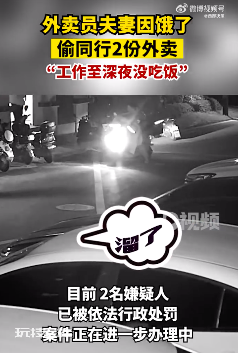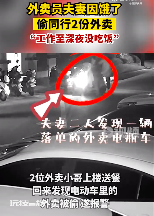 近日,浙江湖州,2位外卖小哥上楼送餐,回来时发现放在楼下电动车里的外卖被偷,遂报警求助。民警查看监控视频后,锁定了一对夫妻,次日下午将2人抓获。经查,夫妻俩也是外卖员,2人因工作至深夜还没吃饭,看到外卖萌生偷吃想法。2人趁小哥上楼送餐时,将外卖拿走放在自己的车上。