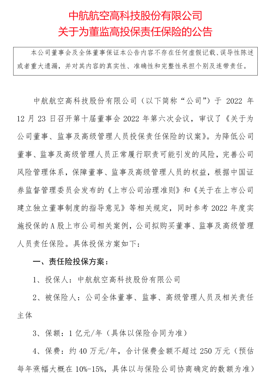 12月24日,中航航空高科技股份有限公司发布了《关于为董监高投保责任保险的公告》,表示为降低公司董事、监事及高级管理人员正常履行职责可能引发的风险,公司拟购买董事、监事及高级管理人员责任保险(简称“董监高责任险”)。
