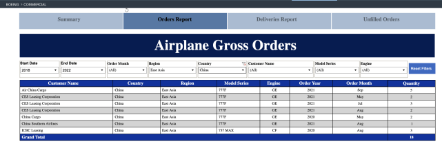 过去五年间,波音在中国市场遇冷。新增新机订单方面,2018年、2019年及2022年,波音在中国大陆市场上“颗粒无收”。2020年和2021年,波音也少有中国内地的民航客机订单,大部分仅为777F货机。