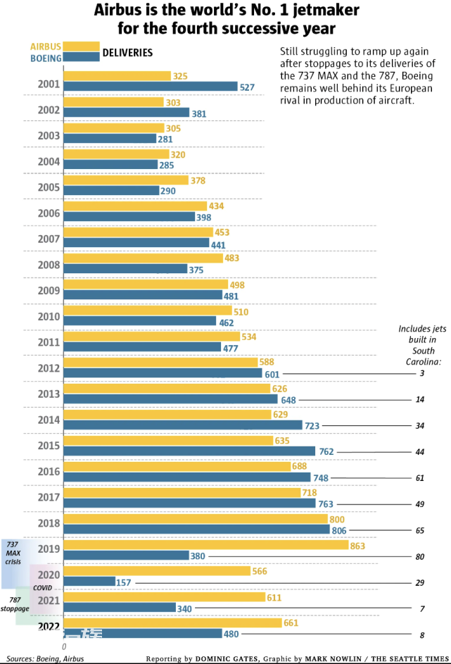 从西雅图时报整理的双寡头历年交付量来看,2019年至今,波音飞机交付量已连续4年落后于空客,不过差距在逐渐缩少。2019年,受737MAX空难事件影响,全球多个国家发出737 Max禁飞令,波音也暂停交付该款机型,导致年度交付量大受影响。