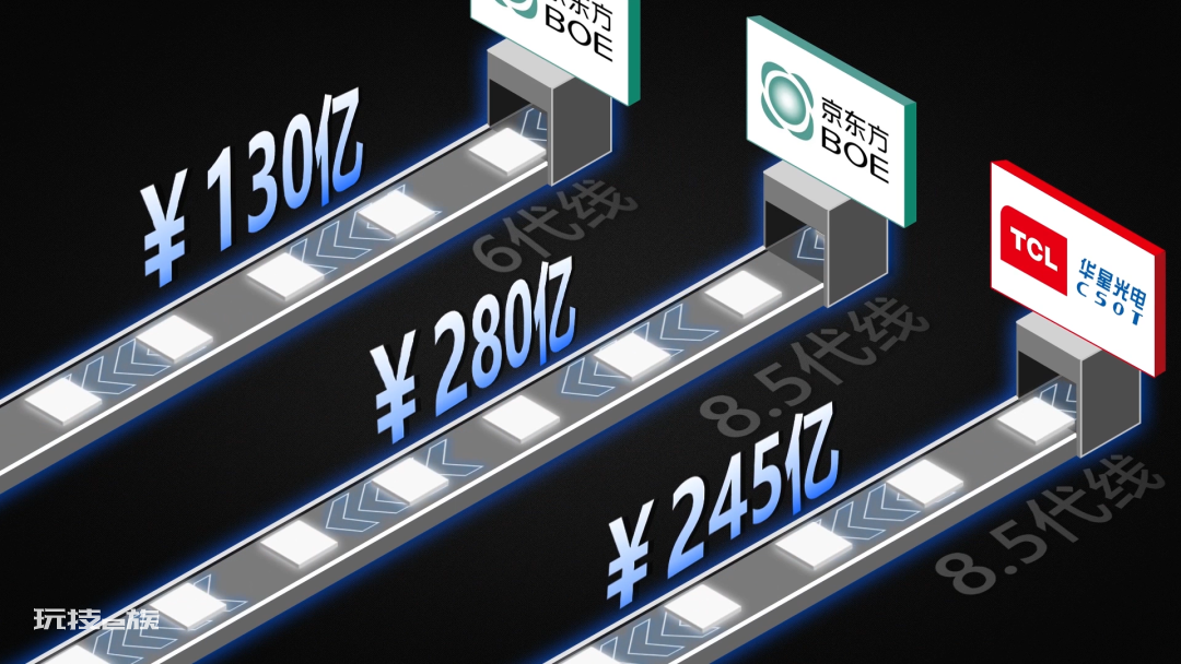 转折发生在2009年,京东方和TCL华星依托于合肥、北京与深圳等地方在财政、土地等方面的支持,开始建设高世代6代线和8.5代线。其中京东方在合肥的6代线的投资总计130多亿元,在北京的8.5代线投资总计280亿元,而TCL华星在深圳的8.5代线总投资也达到了245亿元。