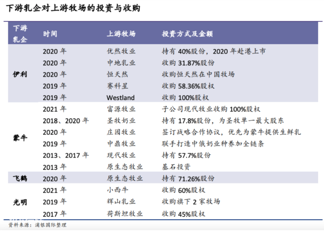 在对于原料成本的控制方面,乳制品企业们也是煞费苦心。浦银国际的研报显示,在2021年之前,下游乳企就已经开始了上游牧场的争夺战——当然短期来看,这也少不了资金的投入。《巴伦周刊》中文版认为,乳制品公司的向上兼并,除了能够减少原料波动对利润的影响外,还有助于各个企业把控生产质量,规避产品风险。