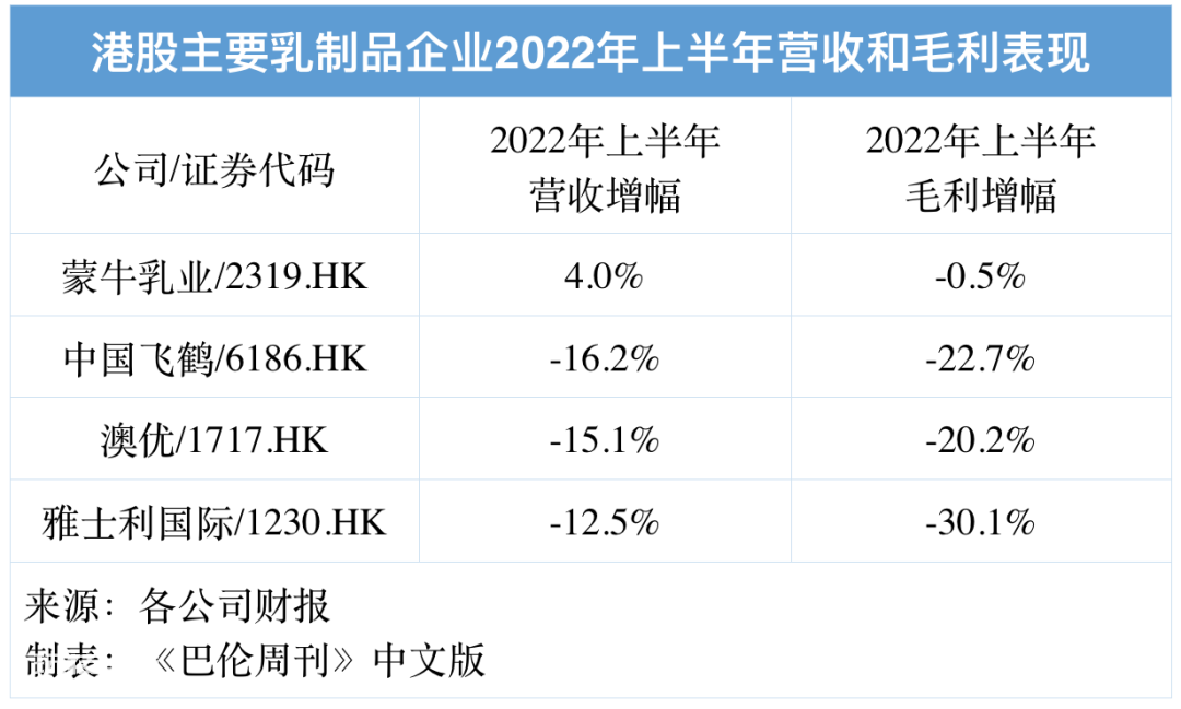例如中国飞鹤、澳优和雅士利国际三家依赖奶粉产品的港股公司,2022年上半年的营收和毛利均录得同比两位数跌幅。