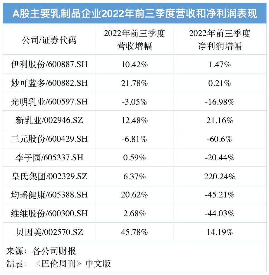 一方面,关于消费者是不是在疫情期间减少了乳制品的消费支出,各家企业大致给出了否定的答案。2022年前九个月,伊利股份的营收增长10.42%至人民币935亿元,妙可蓝多的营收增长21.78%至38.29亿元,新乳业营收增长12.48%至74.80亿元……上表罗列的A股乳企中,只有光明乳业和三元股份的营收有小幅下跌。