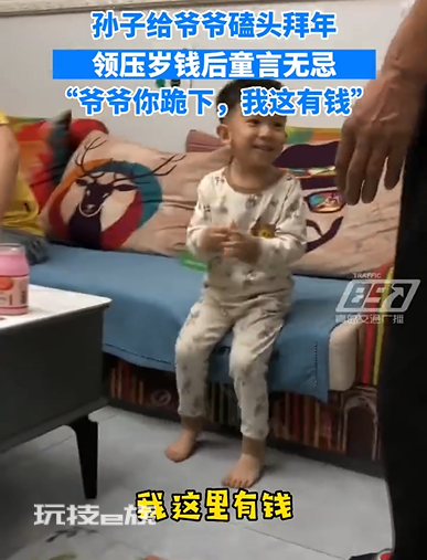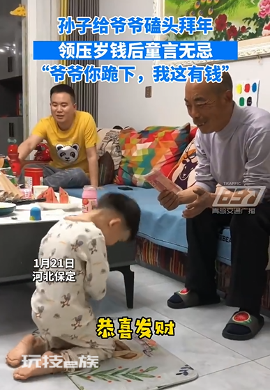 据@青岛交通广播FM897报道:1月21日,河北保定。孙子给爷爷磕头拜年,领压岁钱后童言无忌:“爷爷你跪下,我这也有钱”。网友:小朋友一定以为这是个“有钱就可以坐下”的游戏!