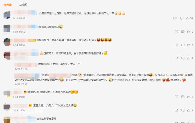 还有网友评论:“小朋友不懂什么是跪,他只知道有钱收,也想让爷爷收到钱开心一下”;“童言无忌童言无忌”;“哈哈哈哈这一家其乐融融,真幸福啊,这小孩太好笑了”;“童年无忌!新年快乐!!家庭气氛真好”;“童言无忌,小孩子开个玩笑无伤大雅”。