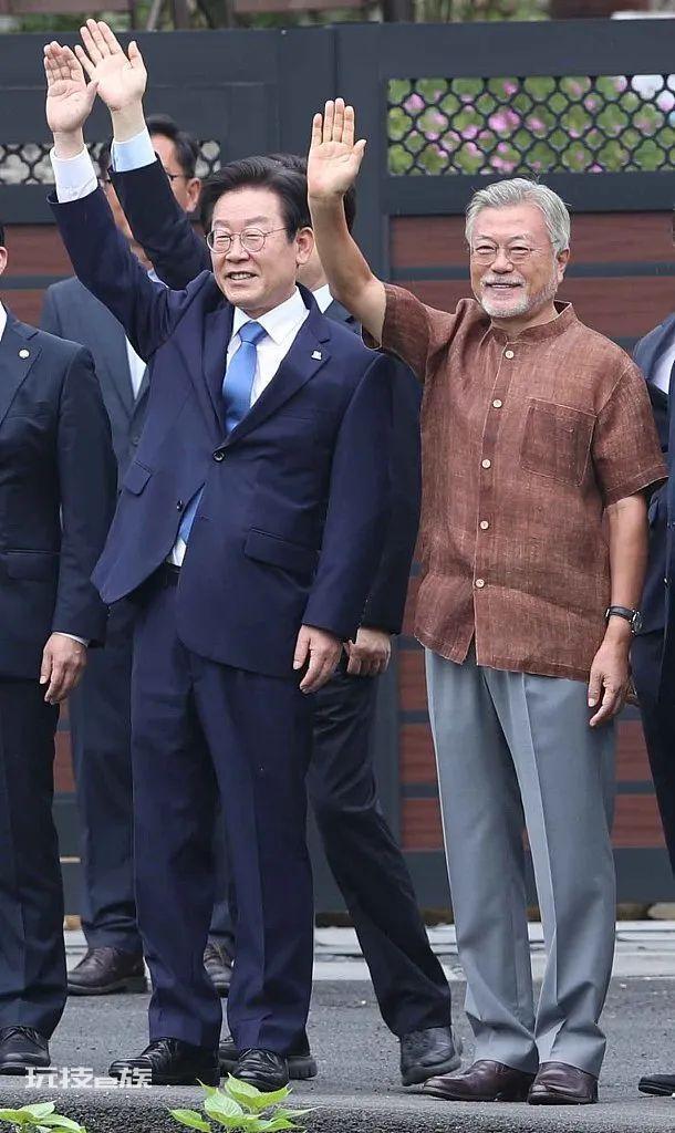 当地时间2022年8月29日,民主党新任代表李在明(左)和前总统文在寅在首尔东南方310公里的梁山文在寅的私人住宅前,向支持者挥手致意。图/视觉中国