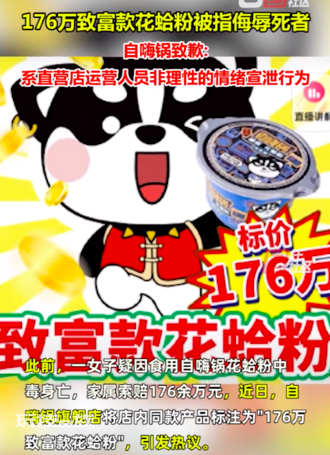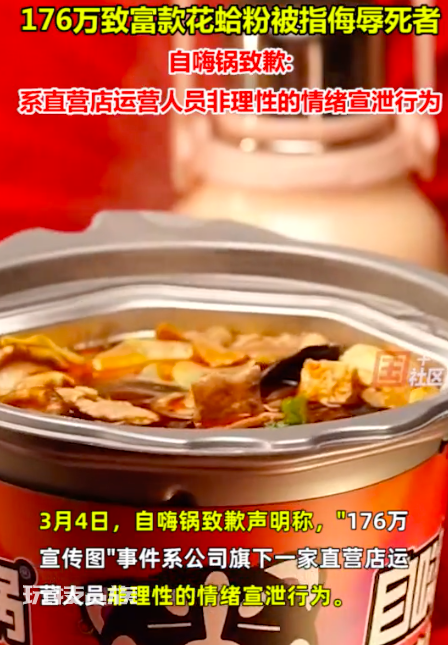 也想出现在这里?点击联系我~ 3月4日,自嗨锅官方微博发布致歉声明称,“176万宣传图”事件系公司旗下一家直营店运营人员非理性的情绪宣泄行为,公司对此深表歉意,对该店铺负责人及相关涉事人员予以辞退等处理。 此前报道,一女子疑因食用自嗨锅花蛤粉中毒身亡,家属索赔176余万元。