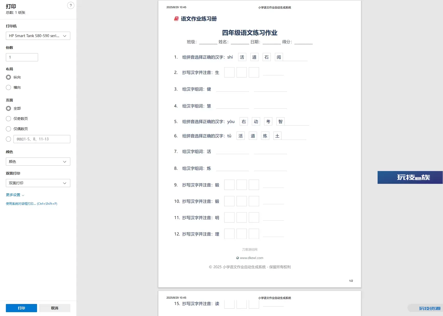 小学一到六年级语文/英语/数学作业出题布置网站源码 支持生成PDF和打印并在底部添加了指定的版权信息和防篡改措施